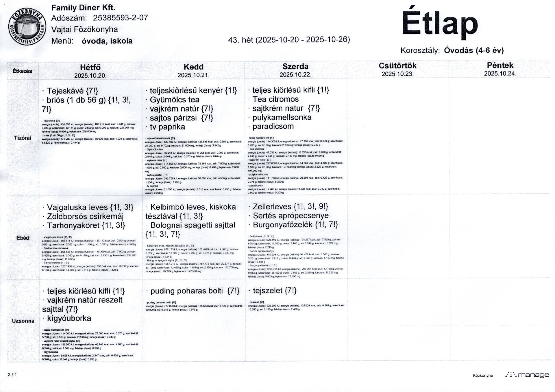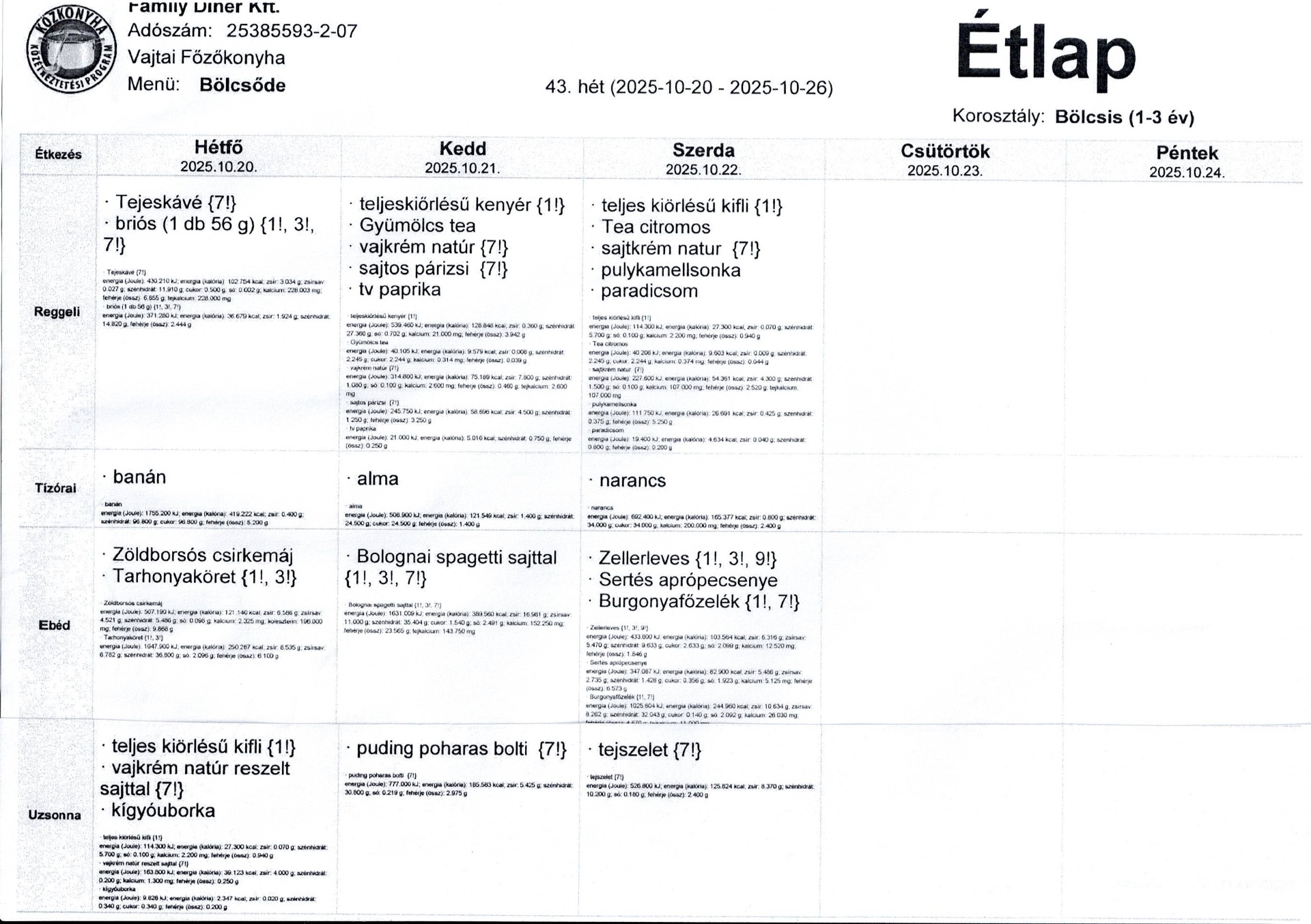 Bölcsőde, Óvoda étlap 2025.10.20-2025.10.22