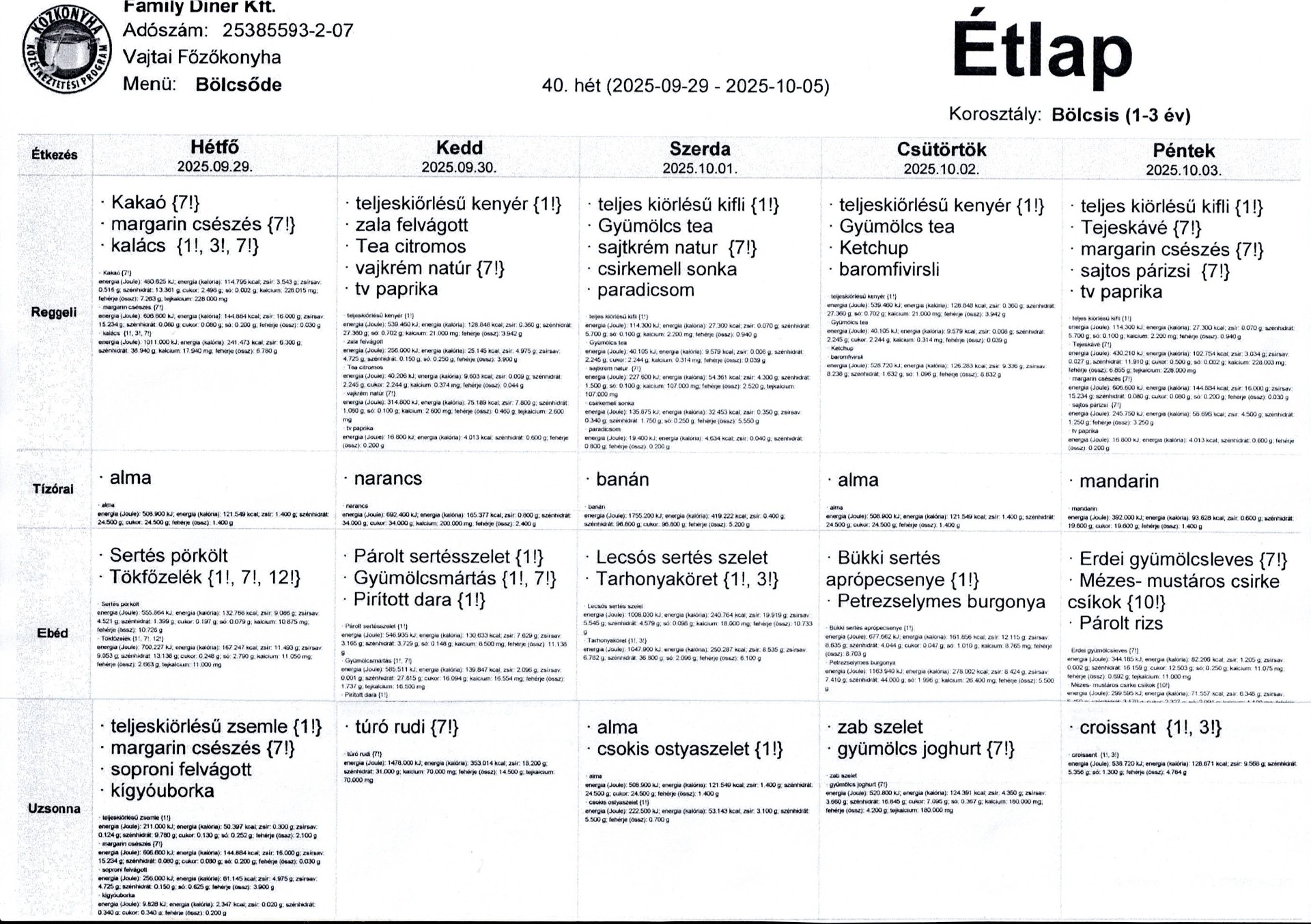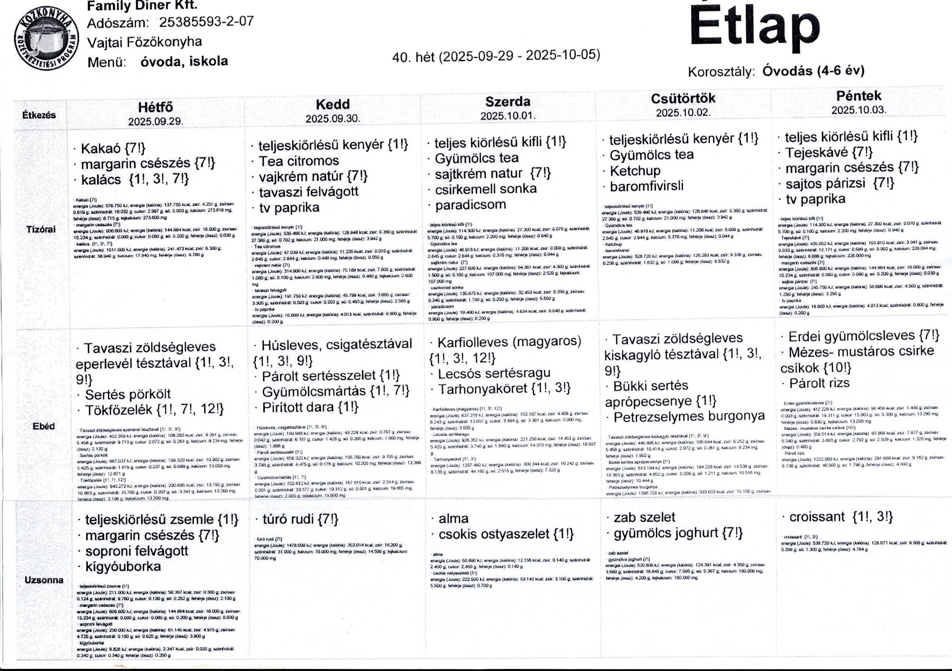 Bölcsőde, Óvoda étlap 2025.09.29-2025.10.31